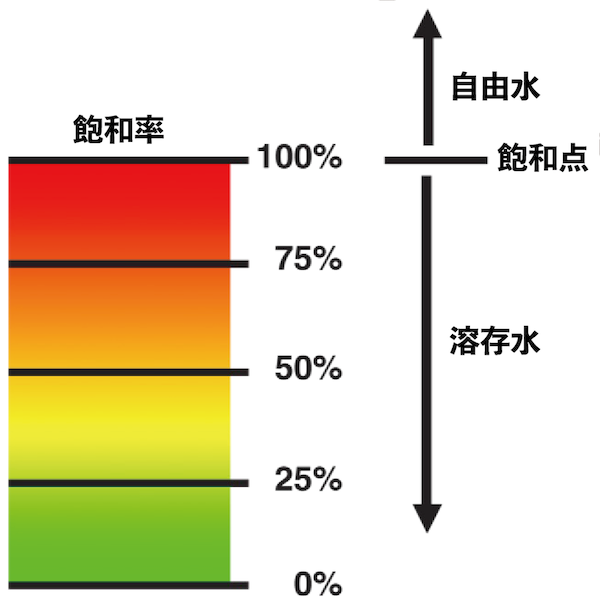 - 100%:溶解限界で、これ以上は遊離自由水や乳化水が出る